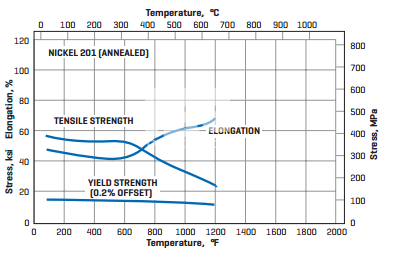 Commercially pure (99.6%) wrought nickel essentially the same as Nickel 200 but with a lower carbon content to prevent embrittlement by intergranular carbon at temperatures over 600°F (315°C). Lower carbon content also reduces hardness, making Nickel 201 particularly suitable for cold-formed items.